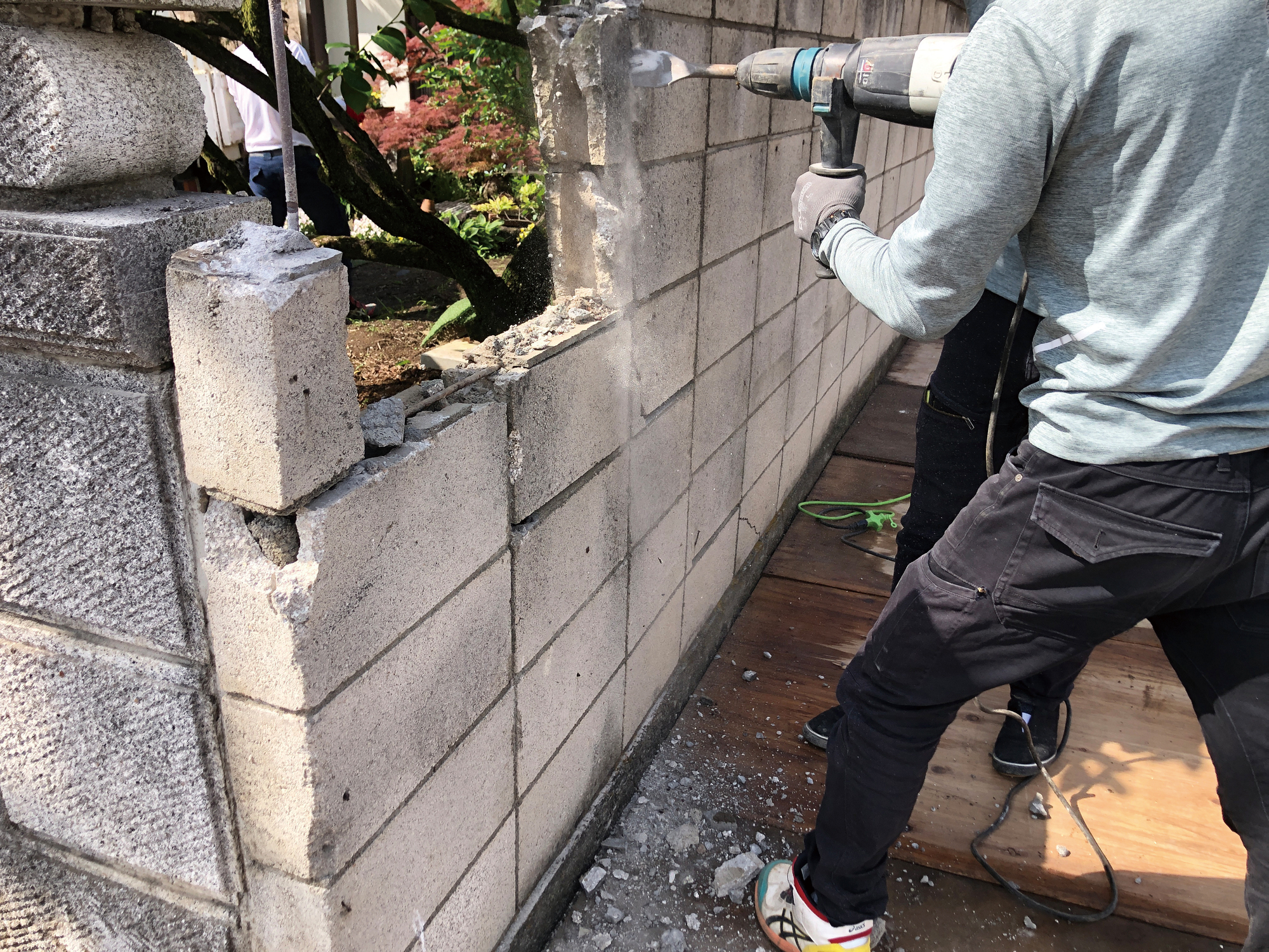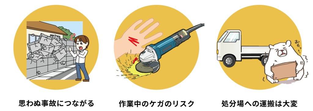 ブロック塀は1個あたりが重く、壊すときに破片が飛んだり、想定外の方向に崩れたりして、転倒・落下・切り傷などのケガにつながりやすい工事です。
