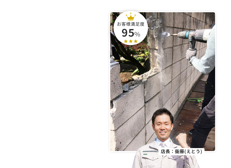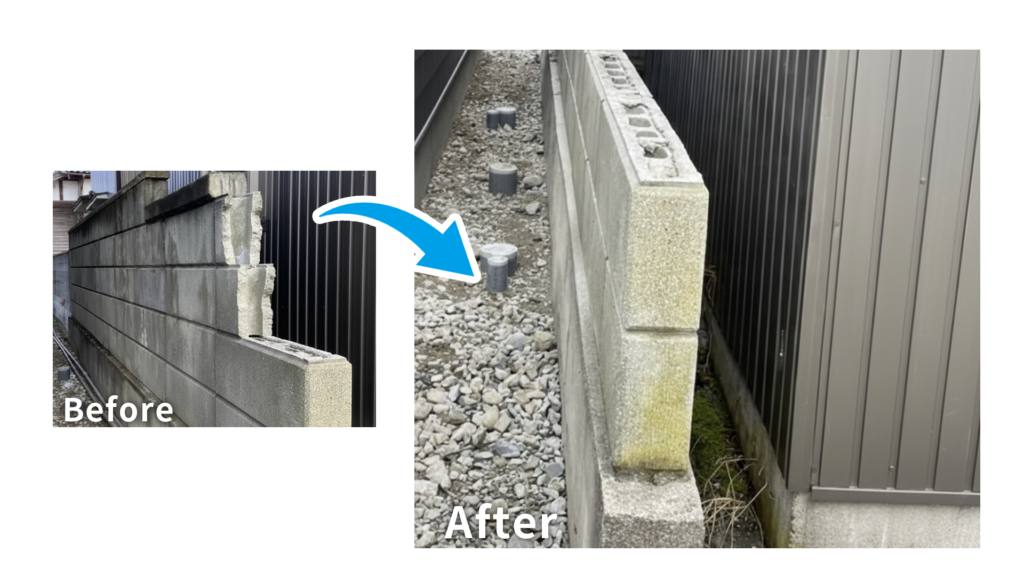 道路沿いの塀が少し傾いていて怖かったのですが、相談したらすぐ現地確認に来てくれて安心でした。養生もしっかりで、作業もスムーズでした。