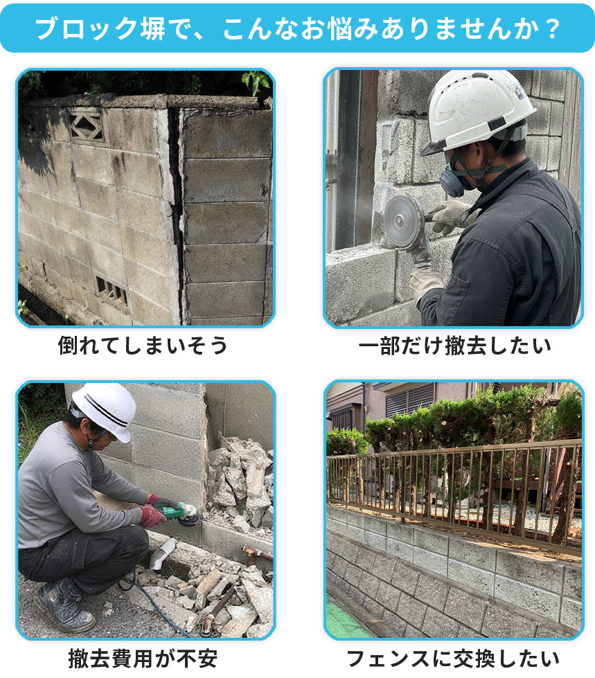 「ずっと放置している」「どこに頼めばいいか分からない」「費用が不安」「ヒビ・傾き・グラつきが心配」「一部だけ撤去したい」など、まずは相談だけでもOKです。お気軽にご相談ください!