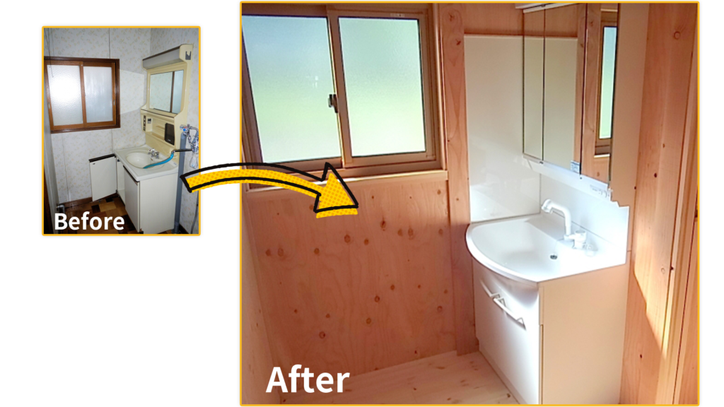 洗面スペースのリフォームを行いました。壁、床、洗面台の交換を行い温かな木の香りに包まれた空間になりました。
