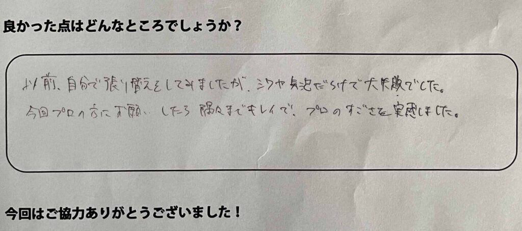 以前、自分で張り替えにをしてみましたがシワや気泡だらけで大失敗でした。今回プロの方にお願いしたら隅々まできれいでプロのすごさを実感しました。
