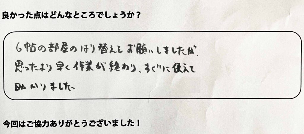 6帖の部屋を張り替えてもらいましたが、思ったより早く作業が終わり、すぐに使えて助かりました。