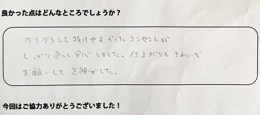 グラグラして抜けやすかったコンセントが、しっかり直って安心しました。仕上がりもきれいで、お願いして正解でした。