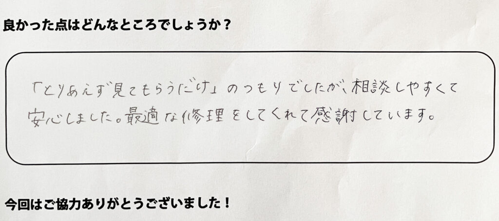「とりあえず見てもらうだけ」のつもりでしたが、相談しやすくて安心しました。最適な修理をしてくれて感謝しています。