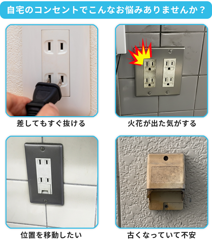 また「位置を移動したい」「たこ足配線が気になるので増設したい」といったご相談も多い一方で、「小さな工事だから頼みづらい」と後回しにされがちです。気になるサインがあれば、早めの点検・修理で安心につながります。