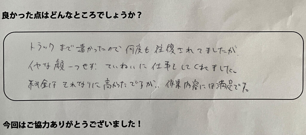 トラックまで遠かったので何度も往復されてましたが、イヤな顔一つせず丁寧に仕事をしてくれました。料金はそれなりに高かったですが、作業内容には満足です。