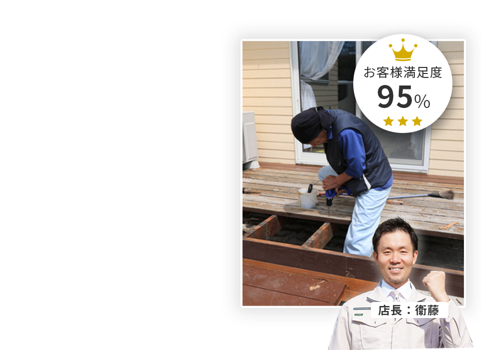 メッセージ:自身も長年戸建てに住んでいるがゆえに様々なお家のお困りごとを体験してきました。その中でもウッドデッキ解体はどこに頼めばいいのか分かりづらいものだと思います。ウッドデッキの耐用年数は材質に寄りますが、早くて5年、丁寧に補修を行っても20年くらいと言われてます。放置していると木材であればシロアリ発生に繋がり、家屋への侵入を許してしまいます。当店はウッドデッキの解体のプロ集団です。お客様のお悩みを迅速かつ適切に解決いたします。作業内容と価格に自信があります。誠心誠意撤去作業をいたしますので、まずはお気軽にご相談ください。