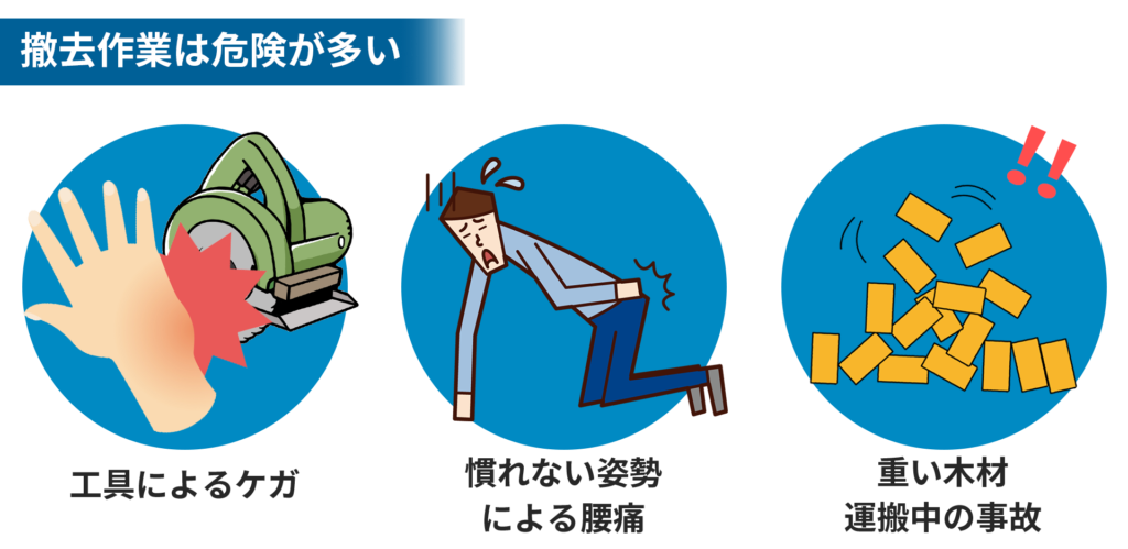 ウッドデッキの規模によっては、DIYで解体してしまった方がコストパフォーマンスが優れているケースも少なくありませんが、初めての作業となるとそれなりの時間がかかる上、誤った工具の使い方による手指の損傷、慣れない姿勢での腰痛、夏場は熱中症などの危険も伴いますので、少しでも不安がある場合は思い切ってプロに任せてしまいましょう。